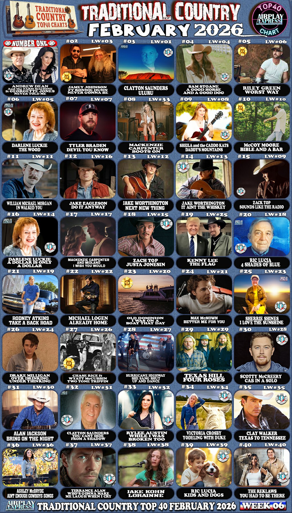 AirplayExpress is back with the Top 40 Traditional Country Singles Chart! Compiled by Wildhorse Entertainment, this chart features the latest hits based on exclusive airplay stats from the AirplayExpress Radio and DJ Network, showcasing the most popular tracks worldwide on AirplayExpress for week 06 of 2026