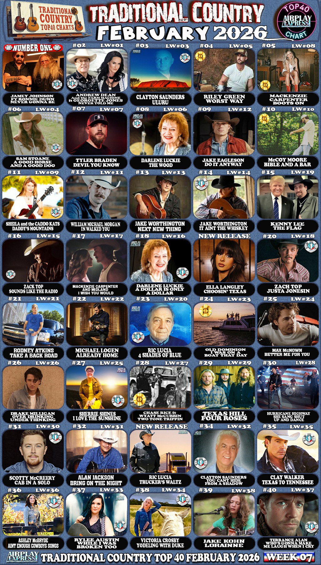 AirplayExpress is back with the Top 40 Traditional Country Singles Chart! Compiled by Wildhorse Entertainment, this chart features the latest hits based on exclusive airplay stats from the AirplayExpress Radio and DJ Network, showcasing the most popular tracks worldwide on AirplayExpress for week 07 of 2026