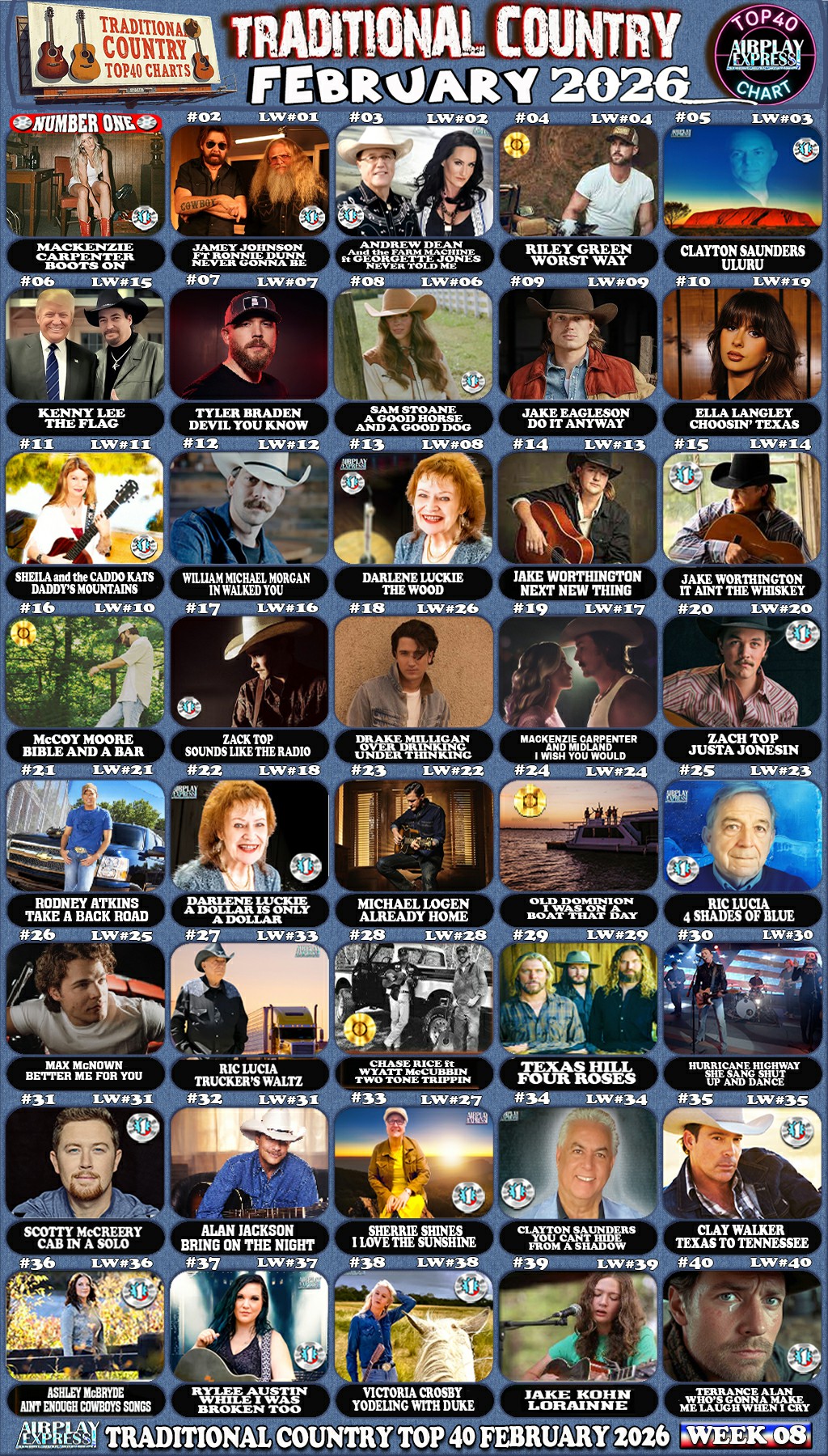AirplayExpress is back with the Top 40 Traditional Country Singles Chart! Compiled by Wildhorse Entertainment, this chart features the latest hits based on exclusive airplay stats from the AirplayExpress Radio and DJ Network, showcasing the most popular tracks worldwide on AirplayExpress for week 08 of 2026