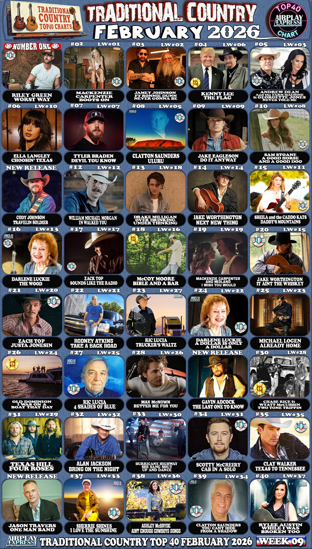 AirplayExpress is back with the Top 40 Traditional Country Singles Chart! Compiled by Wildhorse Entertainment, this chart features the latest hits based on exclusive airplay stats from the AirplayExpress Radio and DJ Network, showcasing the most popular tracks worldwide on AirplayExpress for week 09 of 2026